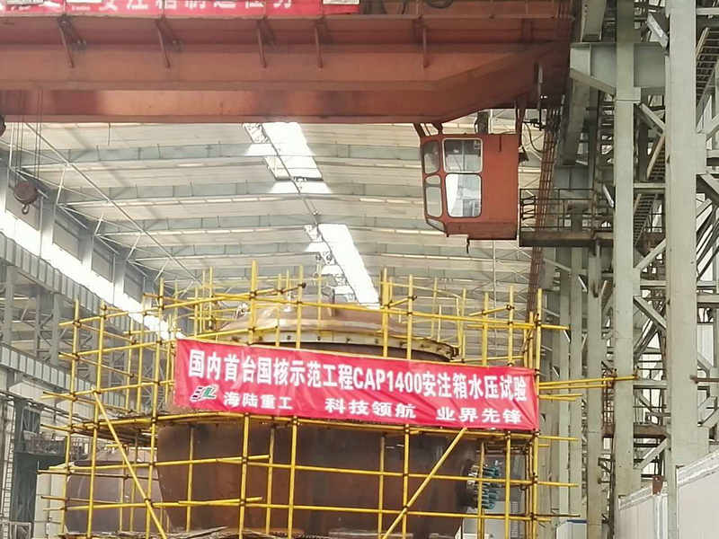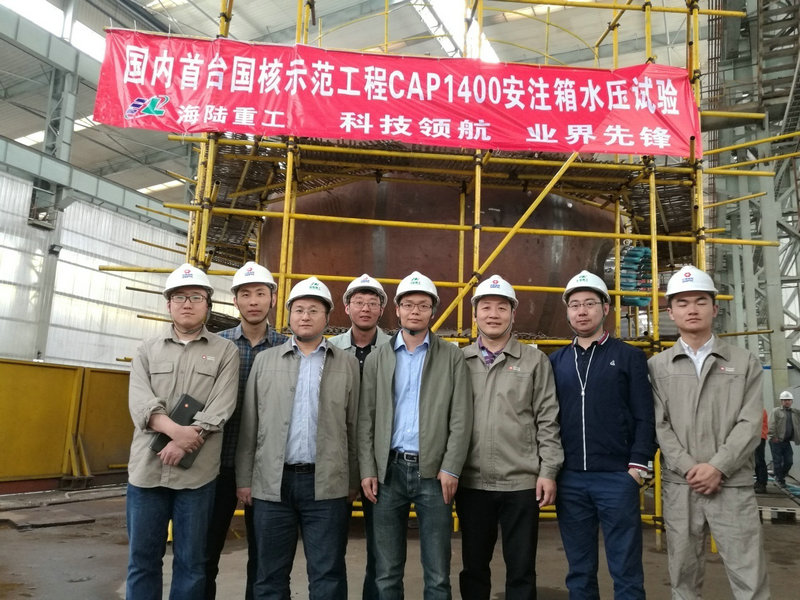 2017年4月25日16時20分,CAP1400示范工程1號機(jī)組首臺安注箱在海陸重工核電車間水壓試驗順利完成!