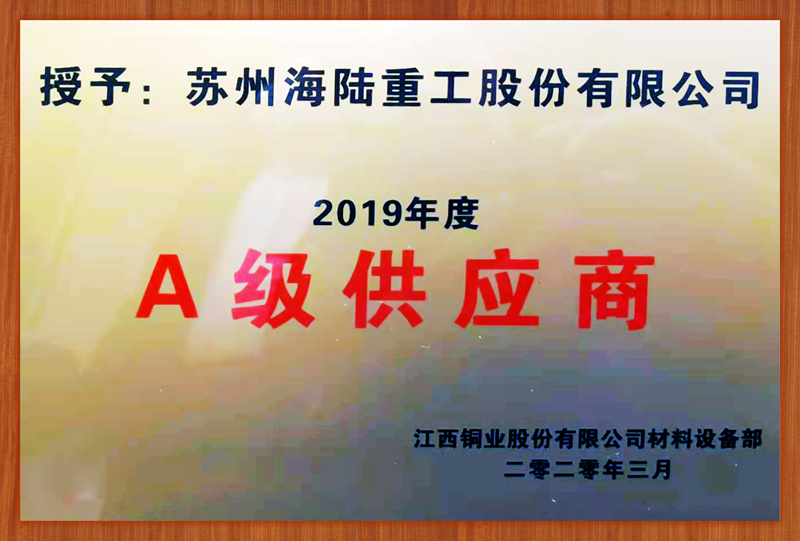 海陸重工被評(píng)為“2019年度江銅A級(jí)供應(yīng)商”